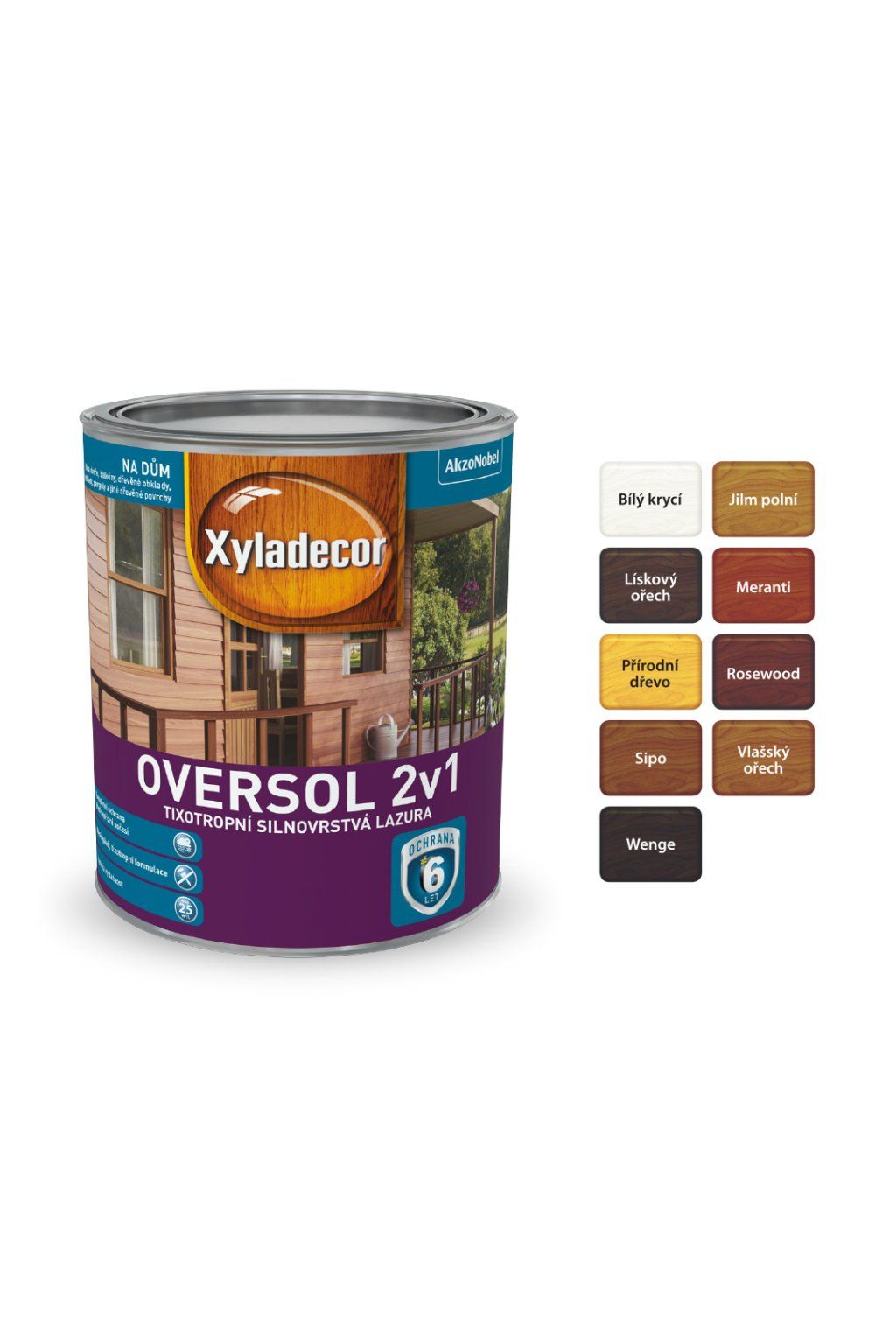 Xyladecor Oversol 2v1 je unikátní silnovrstvá lazura na rozpouštědlové bázi pro použití v exteriéru. Díky své tixotropní konzistenci nestéká a ulehčuje aplikaci. Vytváří silný, elegantně polomatný film na povrchu dřeva. Je určen pro venkovní dřevěné povrchy, jako jsou okna, dveře, balkony, dřevěné obklady a podhledy, pergoly a jiné dřevěné povrchy. Chrání dřevo před povětrnostními vlivy a UV zářením. Není vhodný pro použití v saunách. Pro zvýšenou ochranu proti modrání a hnilobě dřeva v exteriéru doporučujeme podklad napustit impregnačním nátěrem Xylamon HP